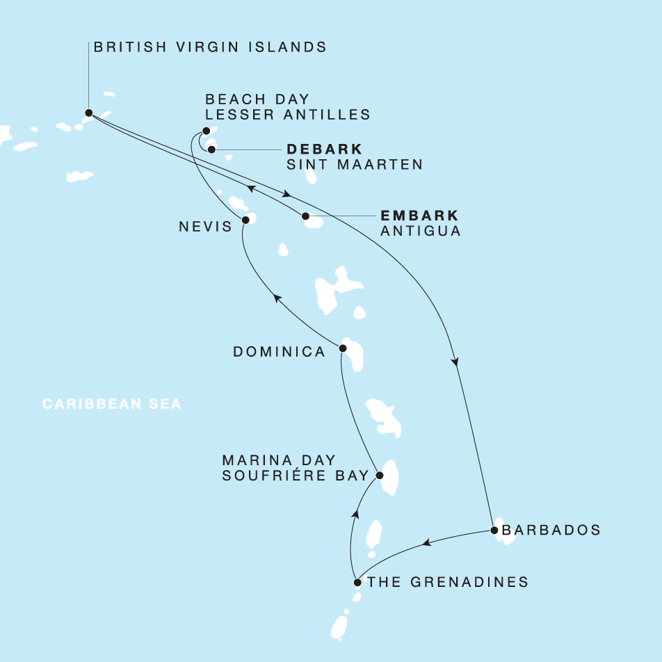 This nine-night voyage opens in St. John's and quickly settles into Caribbean rhythms with a call at Great Harbour, Jost Van Dyke, a laid-back seaside village set along powder-white sands and clear blue waters. A restorative sea day carries you south to discover Speightstown, gateway to golden beaches and UNESCO-recognized Bridgetown. Canouan follows, prized for its castaway beauty and exceptional snorkelling. A Marina Day in Soufrière Bay invites relaxation on the yacht’s marina terrace, framed by striking views of the volcanic Pitons, while Dominica’s Cabrits National Park reveals lush landscapes and abundant wildlife. In colonial Charlestown, play a round of golf at Four Seasons Resort Nevis before a Beach Day and debarkation in colourful Philipsburg complete the voyage.