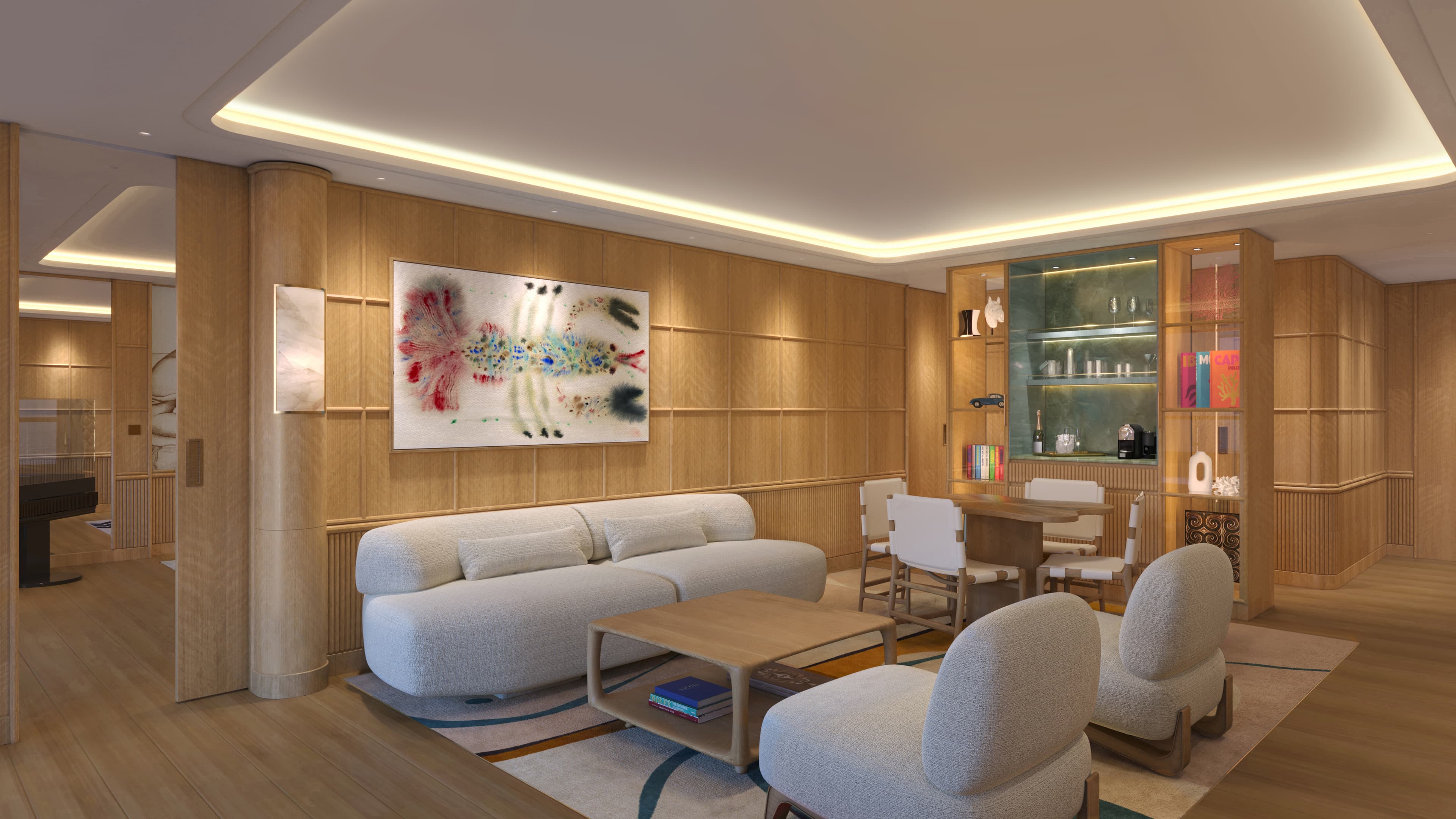 Discover the pinnacle of versatility in our Ocean Suites with Studio, where expansive, floor-to-ceiling ocean views meet luxurious living spaces. This suite features a spa-like double-vanity bathroom with a soaking tub and walk-in shower, a generous living room with a convertible sleeper sofa, and a private terrace designed for lounging and entertaining. The adjoining Studio offers even more room, whether you require additional space for personal staff, children, or simply desire an extra layer of comfort and convenience during your voyage.