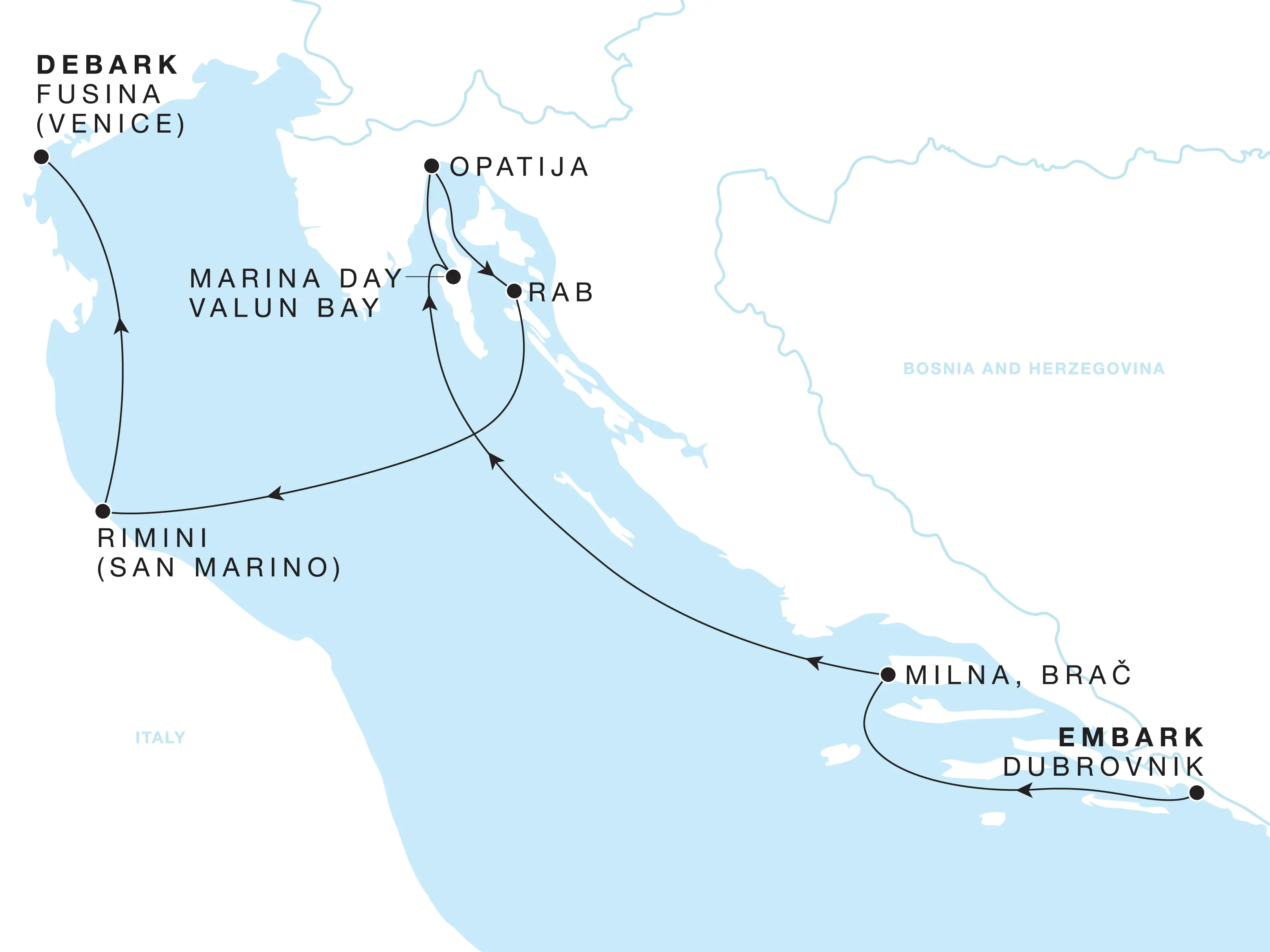 The Adriatic displays its multifaceted splendours, beginning with Dubrovnik’s walled Old City and cobblestone streets. Pause in Milna to sample Dalmatian wines and admire Our Lady of the Annunciation, a graceful baroque landmark by the harbour. A Marina Day in Valun Bay invites pure leisure, with calm waters and a secluded cove ideal for swimming, paddleboarding, or simply relaxing in the sun. Opatija follows with Habsburg-era villas once favoured by Austro-Hungarian royalty and a dining scene that blends tradition with inventive flair. In Rab, stroll a fortified medieval town shaped by Roman, Venetian, and Napoleonic eras, ringed with oak forests and pale-sand beaches. After ascending Rimini’s mountaintop citadel with panoramic views over San Marino, debark in Venice where La Serenissima’s enduring allure awaits.