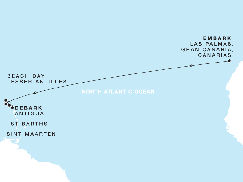 Sail from the rugged beauty of Las Palmas in the Canary Islands across the Atlantic, enjoying a restorative week at sea before reaching the Caribbean. Discover the vibrant cultures of Sint Maarten and legendary nightlife in St Barths, relax during a blissful beach day in the Lesser Antilles, and end your voyage surrounded by Antigua’s tropical splendour.