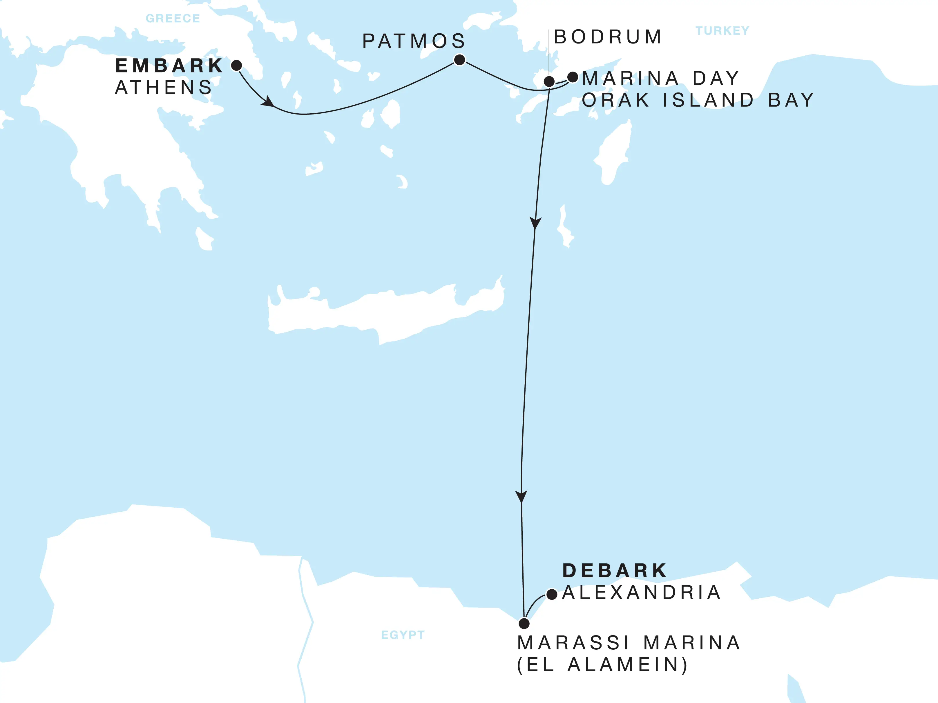 Journey to Egypt, where legendary antiquities and Graeco-Roman treasures take you back in time. Depart from Athens, where classical grandeur sets the stage, before sailing to Patmos, the sacred isle of the Monastery of St. John and the Cave of the Apocalypse. Swim in the crystalline waters of Orak Island Bay, a haven for water activities, and take in Bodrum’s waterfront, where ancient history meets a modern city. After a day at sea, arrive in Marassi Marina El Alamein, a distinguished retreat along Egypt’s Mediterranean coast. The journey culminates in Alexandria, where the Roman catacombs of Kom el Shaqafa, hailed as one of the Seven Wonders of the Middle Ages, reveal Egypt’s enduring legacy as a crossroad of civilizations.