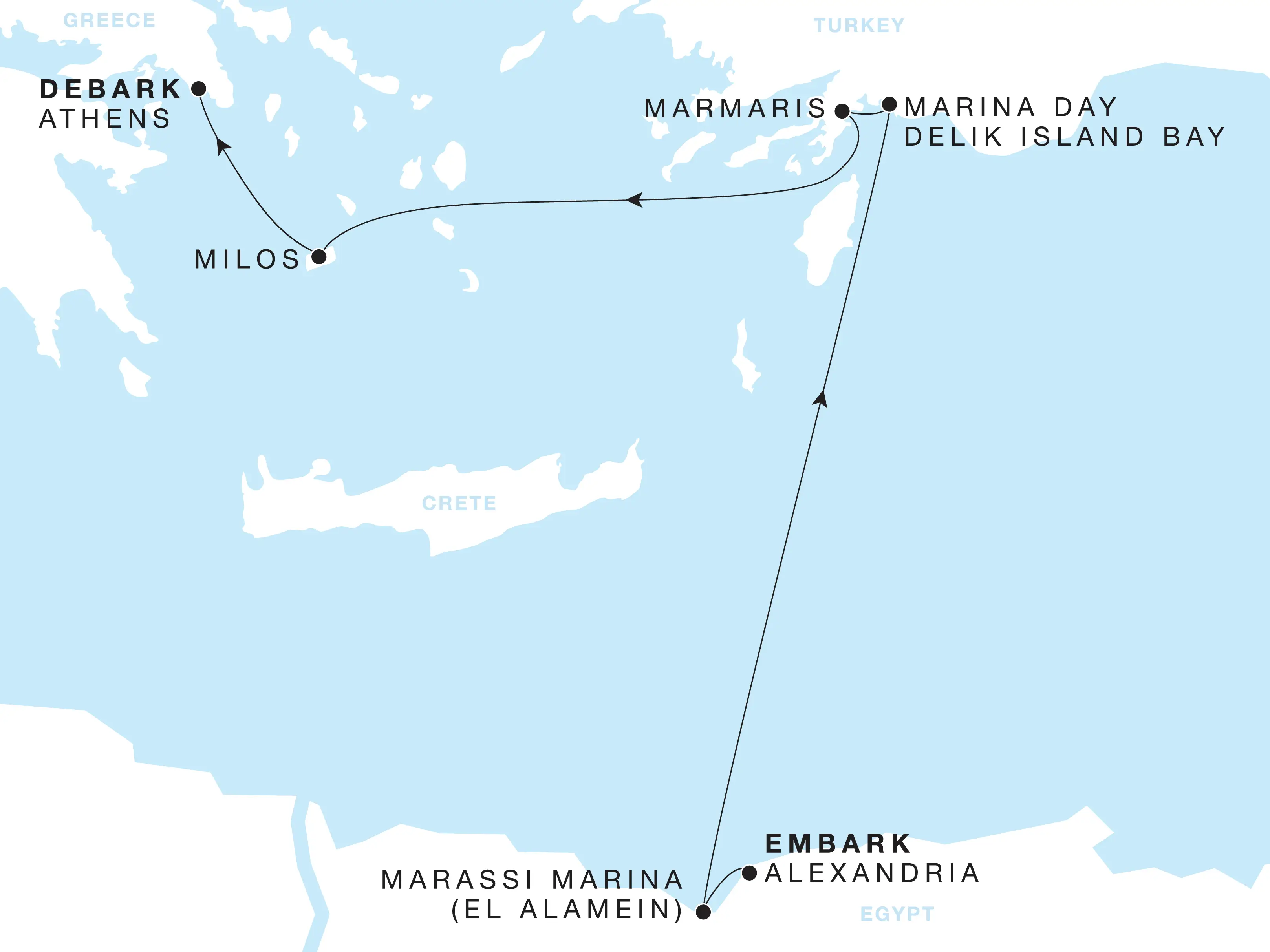 Egypt takes centre stage on this voyage, embarking in Alexandria, a city of ancient dynasties, Hellenistic heritage, and centuries of trade that made it a beacon of the Mediterranean world. From stunning landmarks such as the Citadel of Qaitbay to its rich culinary traditions, Alexandria offers a captivating introduction to your journey. Sail onward to Marina El Alamein, a seaside retreat edged by soft sands and echoes of WWII history. After a day at sea, anchor at Delik Island, admidst against limestone arches and hidden coves. Two overnights in Marmaris bring the colour of Turkish bazaars and the liveliness of the harbourfront. Sail onward to Milos, where volcanic landscapes and pastel-hued villages invite exploration, before concluding in Athens, where classical grandeur provides a fitting finale.