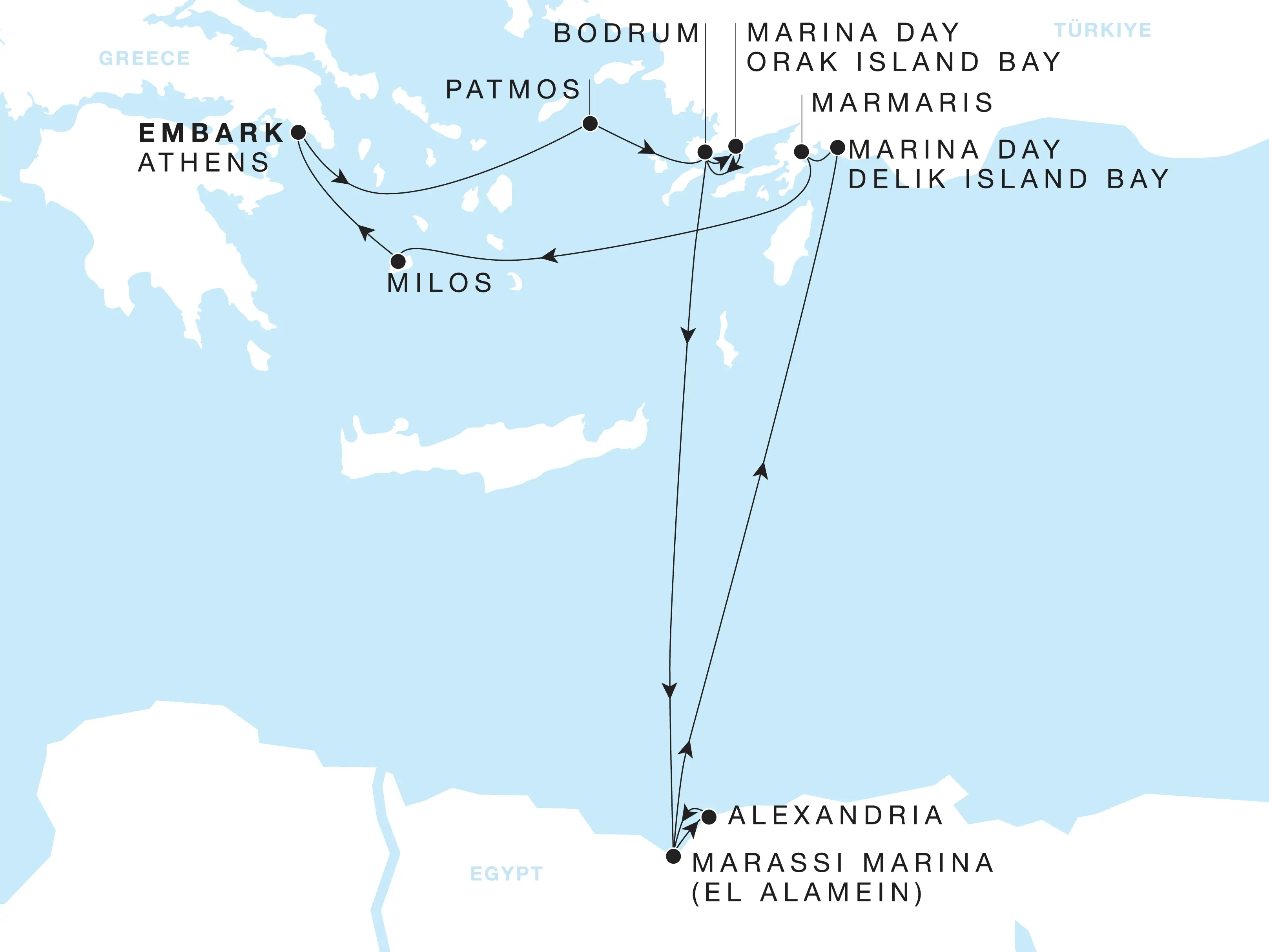 This extended voyage places Egypt at the centre of a journey linking the ancient worlds of Greece and Türkiye. Depart from Athens and sail to Patmos, where the Monastery of St. John and the Cave of the Apocalypse mark sacred ground. Swim in the mirrored waters of Orak Island Bay and stroll Bodrum’s harbour, where antiquity and modernity coexist. Cross the Mediterranean to Marina El Alamein, a coastal haven near the site of pivotal Second World War battles, before spending three days in Alexandria. There, the catacombs of Kom el Shaqafa, the Citadel of Qaitbay, and the modern Bibliotheca Alexandrina evoke its Graeco-Roman legacy. On the return north, call at Delik Island and Marmaris, then Milos, before concluding in Athens, a voyage where Egypt anchors the enduring legacy of Mediterranean civilization.