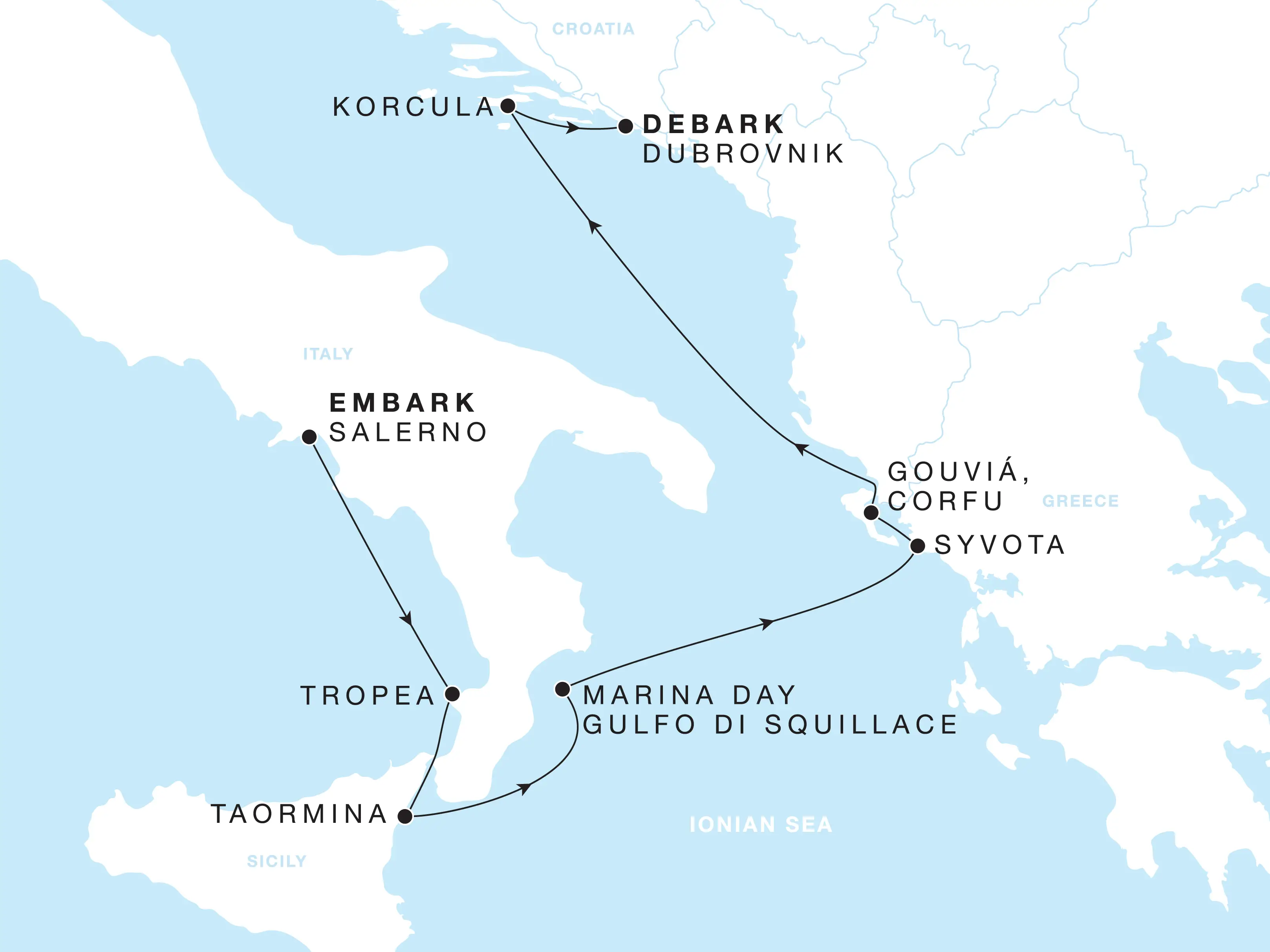 From Salerno, set along the threshold of the Amalfi Coast, sail to Tropea, where the Santa Maria dell’Isola monastery crowns a rocky promontory above winding lanes and turquoise waters. In Taormina, Ionian views, ancient theatres, and the distant silhouette of Mount Etna create a fascinating backdrop. Pause for a Marina Day in Golfo di Squillace for sunbathing, swimming, and watersports, before continuing to Syvota’s, where forested islets and sheltered bays offer quiet respite. Corfu follows, with Venetian architecture, olive groves, and lively marinas, then Korčula, a medieval jewel of Gothic architecture and calm Adriatic waters. The voyage finishes in Dubrovnik, where sea-facing ramparts, terracotta rooftops, and winding streets compose a tableau of history and enchantment.