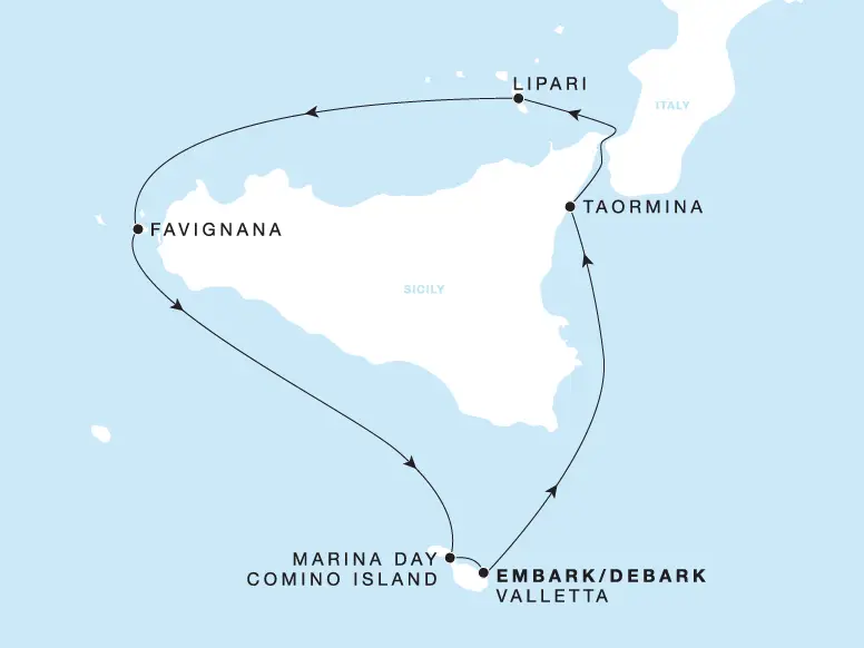 Begin your voyage in Valletta, Malta, where golden harbours and baroque architecture set a captivating stage. Sail to Taormina, Sicily, where dramatic cliffs and winding streets overlook the majestic sea. Continue to Lipari, an island of volcanic landscapes, flower-lined villages, and serene coves. Explore Favignana, Sicily’s hidden gem, renowned for tuna fisheries, sea caves, and crystal-clear waters ideal for snorkelling. Drift into Comino Island’s Blue Lagoon, a veritable playground of shimmering azure waters and secret coves. Conclude your journey back in Valletta, where historic streets and harbours invite reflection on a voyage that blends natural beauty, cultural richness, and the serene allure of the central Mediterranean.