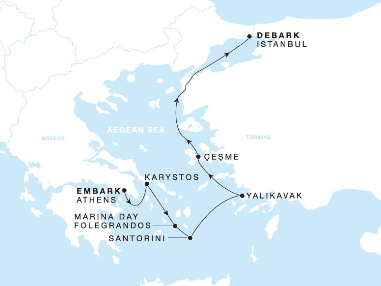 Begin in Valletta, Malta, where baroque architecture and stunning harbour views set the tone for an unhurried Ionian Sea crossing. Crete welcomes you in Agios Nikólaos, alive with waterfront tavernas and island spirit, followed by Santorini’s caldera-carved cliffs and whitewashed villages. In Naxos, the largest of the Cyclades, mountain hamlets and golden beaches reveal authentic island life. Step ashore in Çeşme, a Turkish port where Ottoman heritage meets modern style along the Aegean, before sailing to Spétsai, celebrated for its neoclassical mansions, pine-scented hills, and tranquil coves. Conclude in Athens, where the legacy of civilization continues to inspire the modern world.