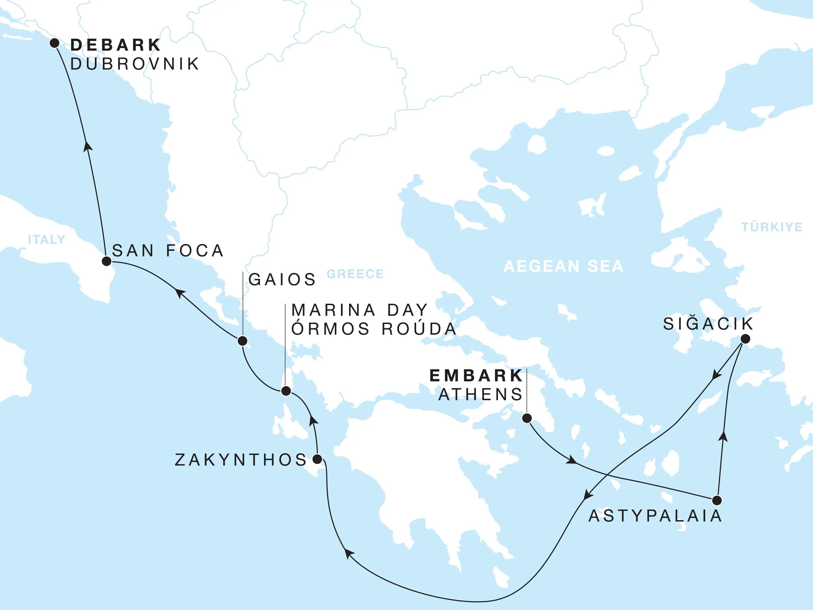 Depart from Athens and embark on a journey through the luminous shores of Greece, Italy, Turkey, and Croatia. Astypalaia captivates with its Venetian castle, whitewashed villages, and hilltop vistas. In Siğacik, explore the 16th-century Ottoman castle and well-preserved ruins, including the Temple of Dionysus. Then sail to Zakynthos, famed for towering cliffs, sapphire waters, and legendary Shipwreck Beach. On a Marina Day, discover Órmos Roúda, a secluded Ionian cove with crystalline waters, before spending two nights in Gaios, where olive groves, Venetian squares, and the nearby beaches of Antipaxos await. In San Foca, gateway to Lecce, soft sands, intimate coves, and seaside tavernas capture the easy rhythm of Italy’s Adriatic coast. Your voyage concludes in Dubrovnik, where medieval ramparts, shimmering limestone streets, and Adriatic vistas make for a magnificent finale.