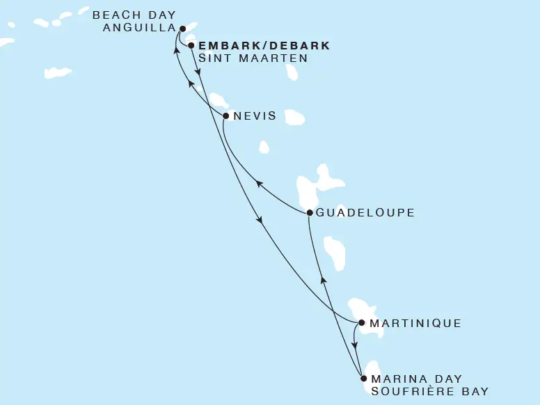 Immerse yourself in the beauty of the French Caribbean, from Martinique’s chic southern coast to the quiet charm of Terre-de-Haut in Guadeloupe. Enjoy a marina day in Soufrière Bay, explore Nevis’s historic Charlestown, and unwind on Anguilla’s unspoiled beaches before returning to Sint Maarten.