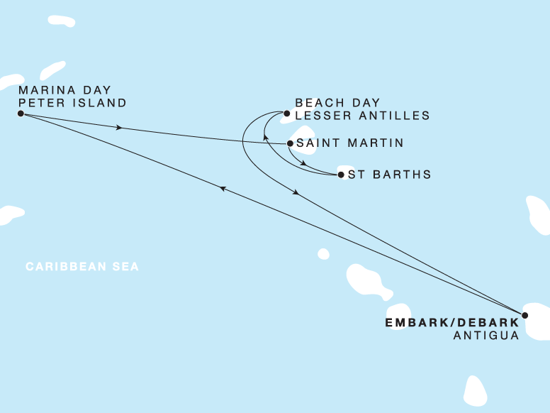 This five-night voyage departing from St. John’s, Antigua, offers the best of the Lesser Antilles. Begin with partaking in water sports and enjoying the sapphire waters of one of the best-kept secrets in the British Virgin Islands, Peter Island. After the Marina Day, dine in charming waterfront bistros and shop boutiques in Marigot, Saint Martin’s capital, with a unique blend of French and Dutch heritage. Laidback Gustavia is your gateway to enjoying a full day and late evening of chic St Barths’ cobblestone streets and natural beauty. A beach day ends this voyage in quintessential Caribbean fashion before returning to St. John’s.