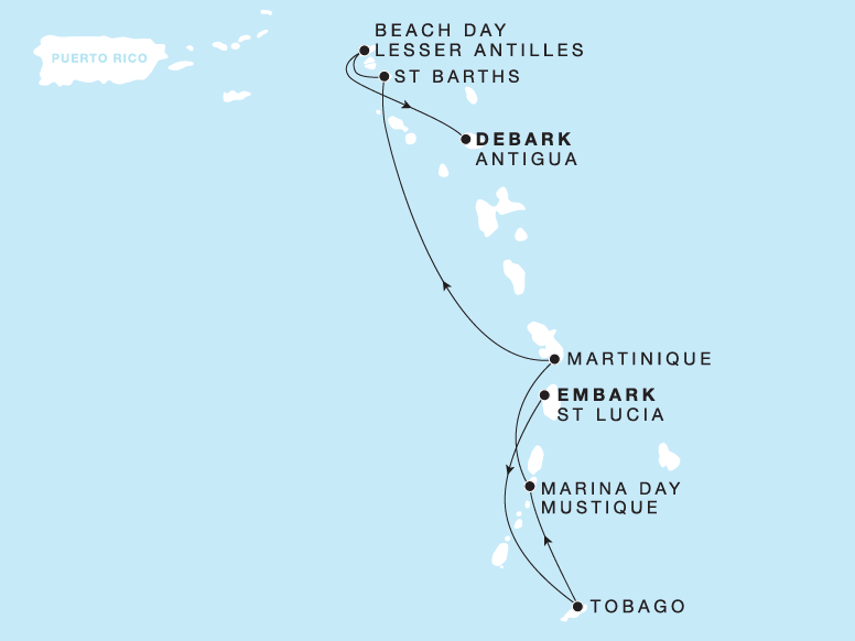 Setting sail from bustling Castries, this Lesser Antilles itinerary unfolds across seven nights of varied island character. Charlotteville introduces the slow pace of a peaceful fishing village from where rainforest trails and secluded coastal paths meander. A Marina Day off Mustique centres on time aboard, swimming in the marina terrace netted pool, and sampling the yacht’s collection of water toys. In Le Marin, a yachting capital of the Caribbean, polished marinas and French-Caribbean culture shape a cultured experience. A restorative sea day precedes Gustavia, St Barths, known for its exceptional dining and luxury boutiques. A Beach Day in the Lesser Antilles leads into St John’s, bringing the journey to a close.