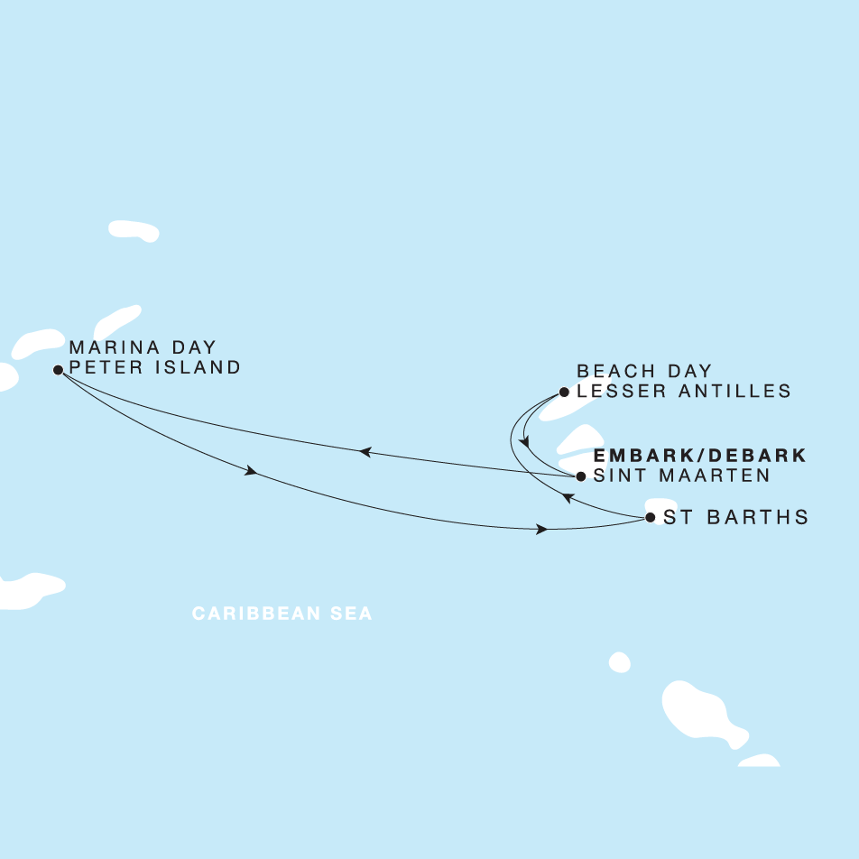 Begin in Philipsburg, where your five-night voyage eases into the Lesser Antilles. Begin with a dedicated Marina Day in Peter Island for unhurried time on the water with access to the yacht’s private collection of water toys and the marina terrace netted pool. In picturesque Gustavia, an overnight and two full days allow plenty of time for refined dining, browsing designer boutiques, and immersion in the blend of French and Caribbean culture. A restorative beach day resets the rhythm before arrival in Philipsburg, completing an intimate escape shaped by island energy and the freedom of the sea.