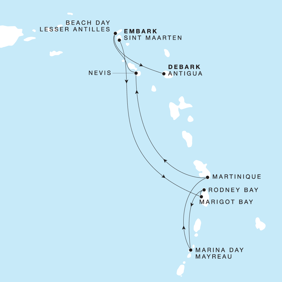 Depart from Philipsburg, Sint Maarten, into the serene waters of the Caribbean before being welcomed by the dense emerald forests, awe-inspiring beaches, and majestic mountains of Marigot Bay. A spectacular sunset awaits in Rodney Bay on the northern tip of St. Lucia, then enjoy watersports on the clear waters off Mayreau, the smallest inhabited isle of the Grenadines. Kick off the holiday season strolling Le Marin’s colourful boutiques and charming bars before sailing to Charlestown, the birthplace of Alexander Hamilton, where stately Georgian manors, lively cafés, and fascinating museums are yours to discover into the late evening. A beach day brings the sandy white beaches and turquoise waters of the Lesser Antilles to the forefront before ending your voyage in St. John's.