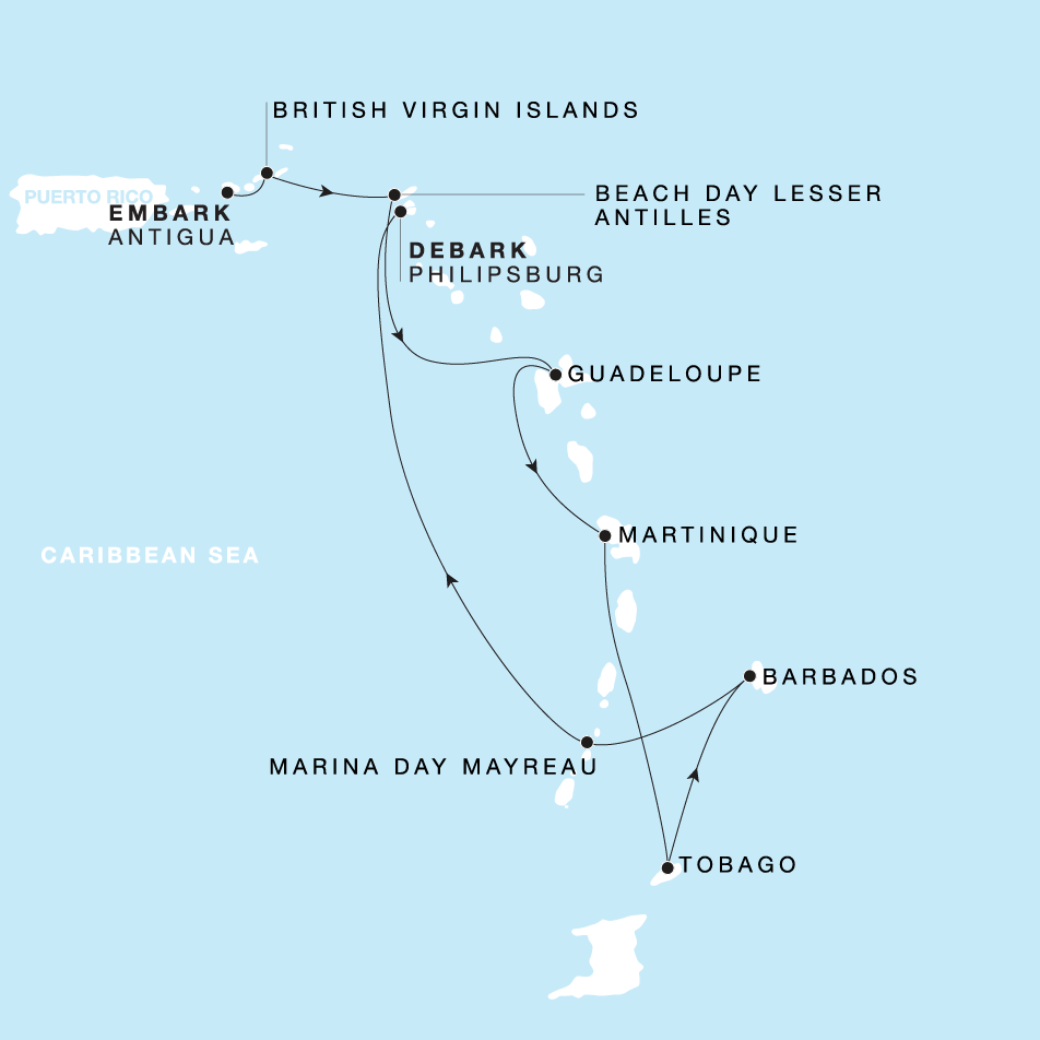 Embark in St. John’s and voyage to Frenchman’s Cay , where you’ll hop from chic cafes to fun-loving bars in one of the most picturesque marinas in the British Virgin Islands. A Beach Day fully gets you into island rhythm before exploring the botanical gardens and tranquil waterfront village of Deshaies, on Guadeloupe’s quieter side. In Saint Pierre, savour Martinique’s signature fusion of French, Creole, and African cuisine between wandering the island’s wild jungle trails, or diving its many reefs and shipwrecks. Discover the white-sand beaches of Charlotteville and the culture of Speightstown, then lounge on the yacht and partake in water sports during a Marina Day in Mayreau. Spend a leisurely day at sea before concluding in Philipsburg, Sint Maarten.