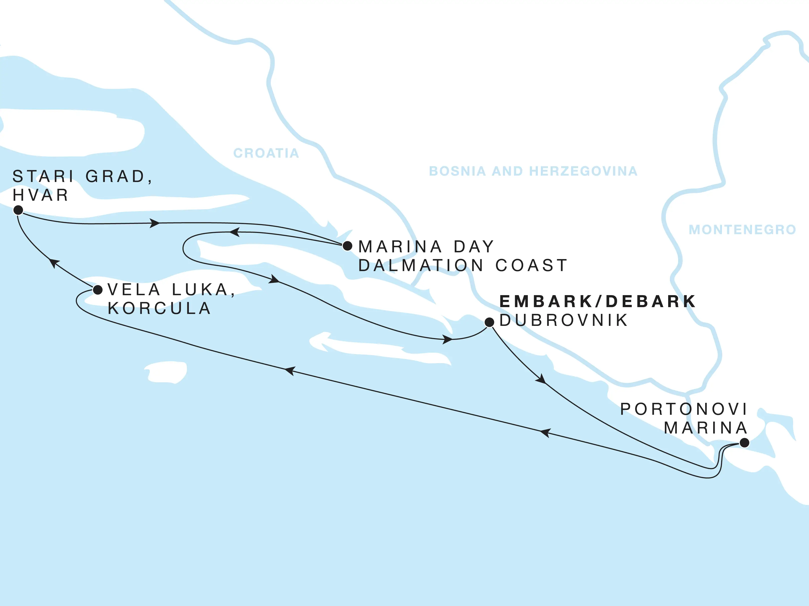 Begin your journey in Dubrovnik, a city of medieval splendour and towering stone walls. Sail to Luštica, Montenegro, where traditional stone villages, family-run olive presses, and hidden coves evoke the rustic draw of the Adriatic. Continue to Vela Luka on Korčula, where prehistoric caves, the world’s longest mosaic, and mineral-rich, therapeutic mud baths reveal a legacy of artistry and wellbeing. Next, Hvar entices with distinctive pebble shores, ancient stone streets, and a spirited harbour atmosphere. Anchor at Milna Bay, an intimate marina embraced by forested slopes and aquamarine waters, before returning to Dubrovnik, where sea and stone meet in a serene finale to your Adriatic journey.