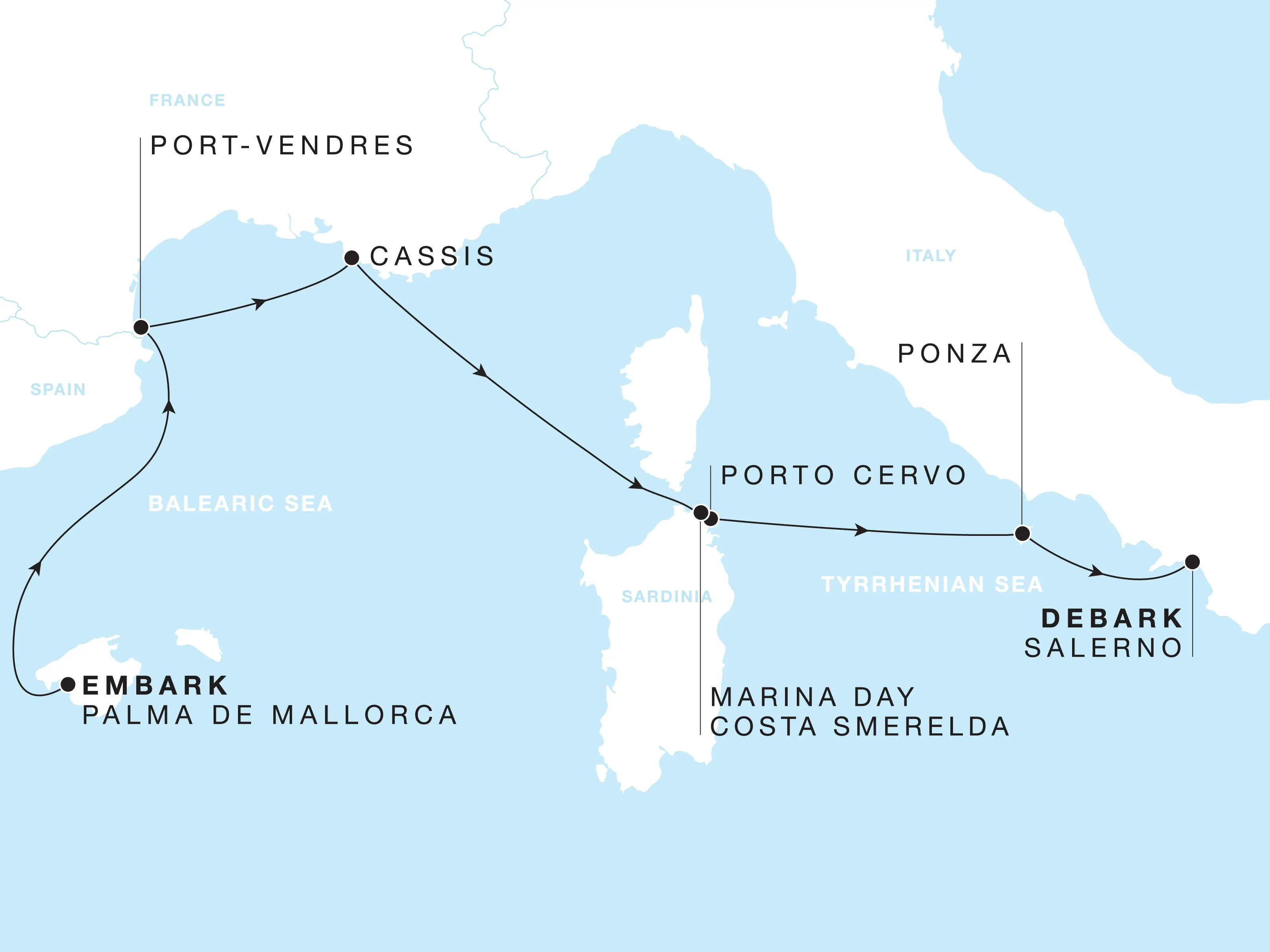 Depart Palma de Mallorca and sail along the French coast to Port-Vendres, a colourful harbour shaped by Catalan heritage, then onward to Cassis, nestled beneath limestone cliffs and surrounded by vineyards. A day at sea allows time to enjoy the yacht’s comforts before arriving at Sardinia’s Costa Smeralda. Two nights in Porto Cervo invite exploration of intimate piazzettas, exclusive marinas, and refined seaside dining options. Continue to Ponza, where volcanic landscapes and crystalline waters reveal the wild beauty of the Pontine Islands. The voyage concludes in Salerno, where medieval walls, palm-lined promenades, and the hills of Amalfi create a finale steeped in the romance of southern Italy.